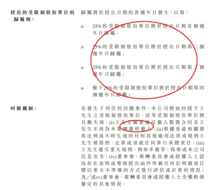 乐华文娱公告透露,这笔1250万股份每年解锁25%,而且奖励霸术附带的回拨要求透露,一朝王一博不再是乐华文娱的签约艺东说念主,则该股份奖励霸术将自动失效。