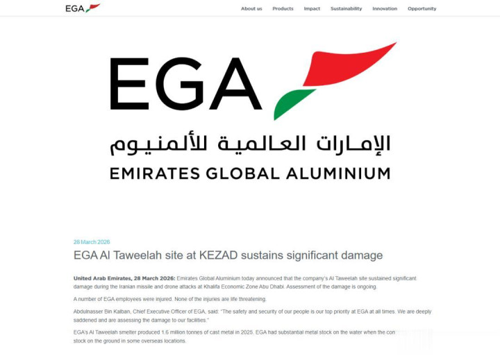 第二重是“炸厂”,这比断粮更狠。3月28日,伊朗使用导弹与无东说念主机打击EGA位于阿布扎比哈利法经济区的塔维拉中枢分娩基地,阿联酋环球铝业官方公告证据,电解铝冶真金不怕火厂与氧化铝高超厂,均遭严重自便。